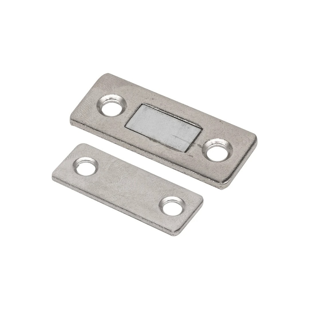 Fecho magnético niquelado indicado para portas de armários, balcões, vitrines e móveis em geral. Proporciona fechamento firme e discreto, mantendo a porta alinhada e bem vedada.