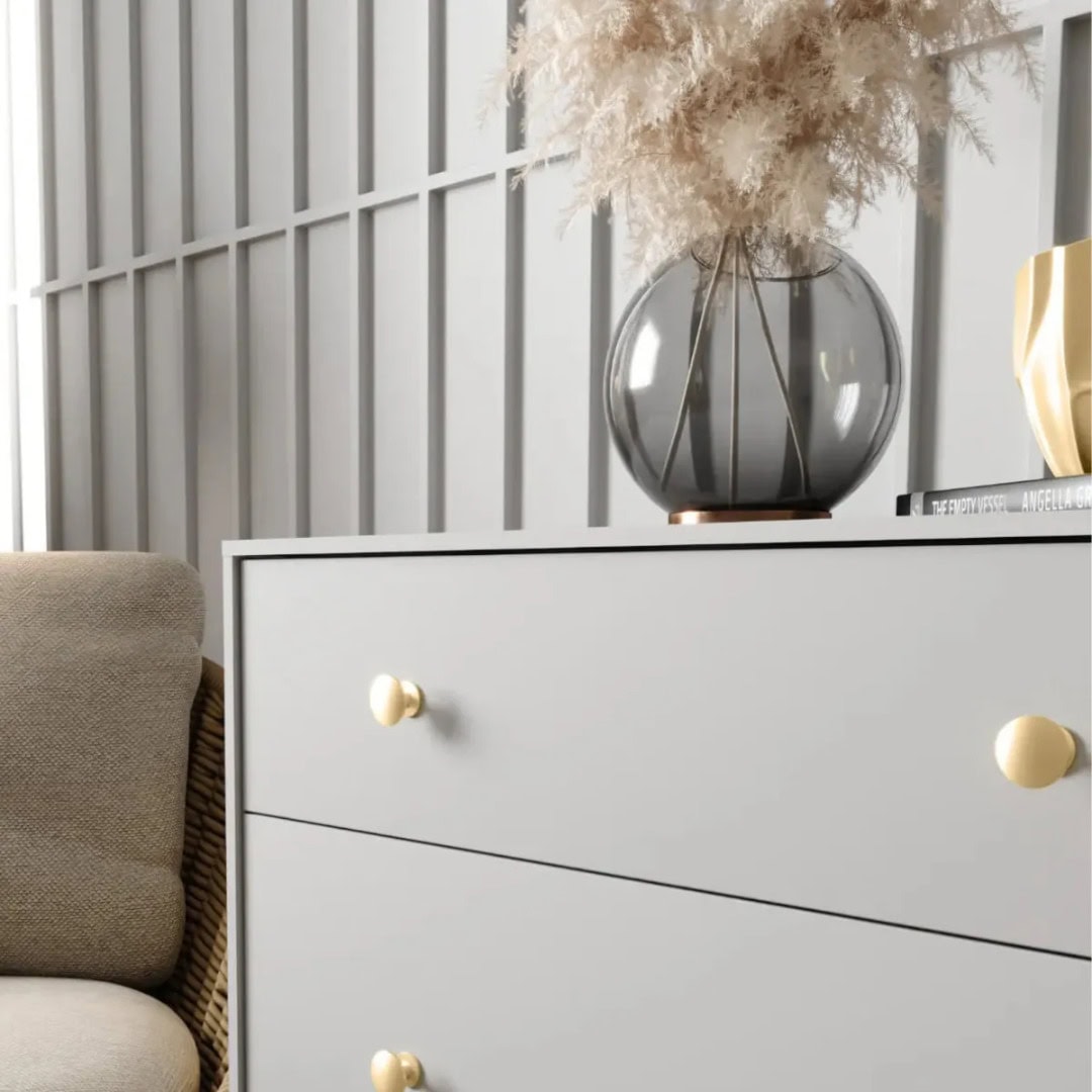 Puxador tipo ponto redondo com acabamento dourado escovado, ideal para móveis como gavetas, armários e portas que demandam visual sofisticado e discreto, com furação de um único ponto.