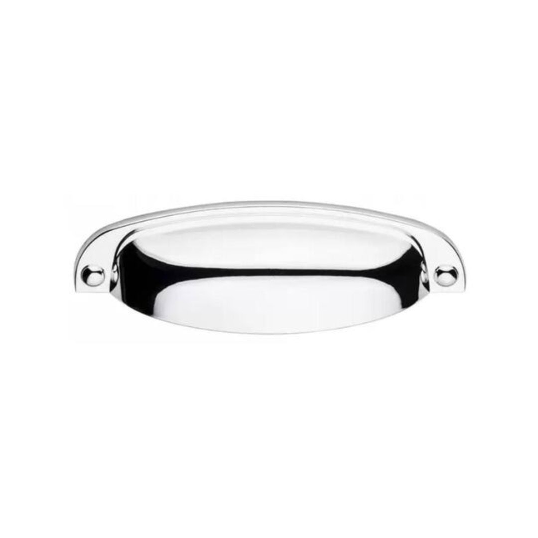 Puxador de concha no estilo provençal com acabamento cromado brilho, ideal para gavetas, armários e portas de móveis que exigem um visual clássico e elegante.