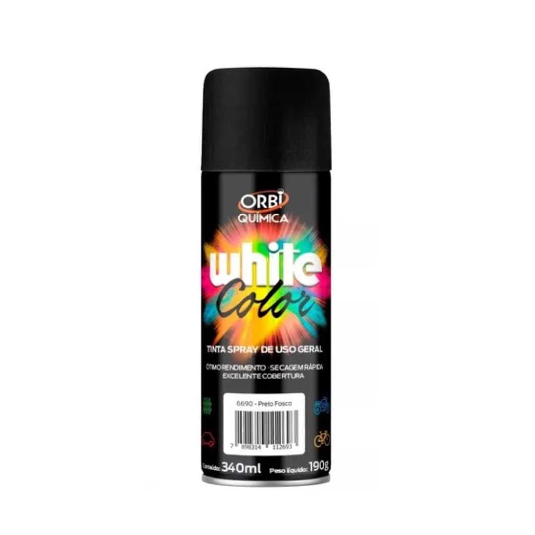 Tinta em spray ORBISPRAY Preto Fosco 340 ml / 190 g, desenvolvida para pintura de uso geral com acabamento fosco uniforme e boa cobertura em diversas superfícies. Produto ideal para aplicações em metais ferrosos e não ferrosos, madeira, objetos decorativos, móveis, bicicletas e peças diversas, proporcionando alta aderência, secagem rápida e resistência às intempéries. Sua formulação em aerossol facilita a aplicação, garantindo acabamento profissional sem escorrimentos quando aplicado de forma correta. Indicado para uso em projetos de manutenção, decoração, reparos e customizações.